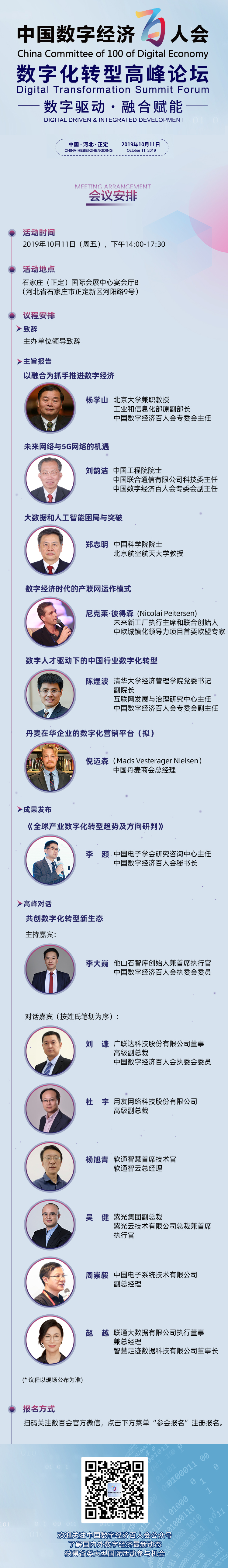 為加快推動實體經(jīng)濟與數(shù)字經(jīng)濟融合發(fā)展,促進(jìn)新舊動能轉(zhuǎn)換,培育新的經(jīng)濟增長點,助力數(shù)字經(jīng)濟強國建設(shè)。經(jīng)黨中央、國務(wù)院批準(zhǔn),由工業(yè)和信息化部、河北省人民政府共同主辦的“2019中國國際數(shù)字經(jīng)濟博覽會”(以下簡稱“博覽會”)將于10月10日至13日在石家莊(正定)國際會展中心舉行。受主辦方委托,中國電子學(xué)會、中國數(shù)字經(jīng)濟百人會定于博覽會期間舉辦“中國數(shù)字經(jīng)濟百人會年度工作會暨數(shù)字化轉(zhuǎn)型高峰論壇”。